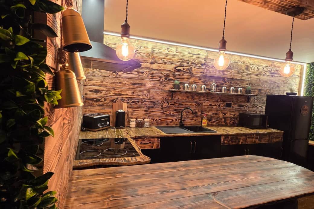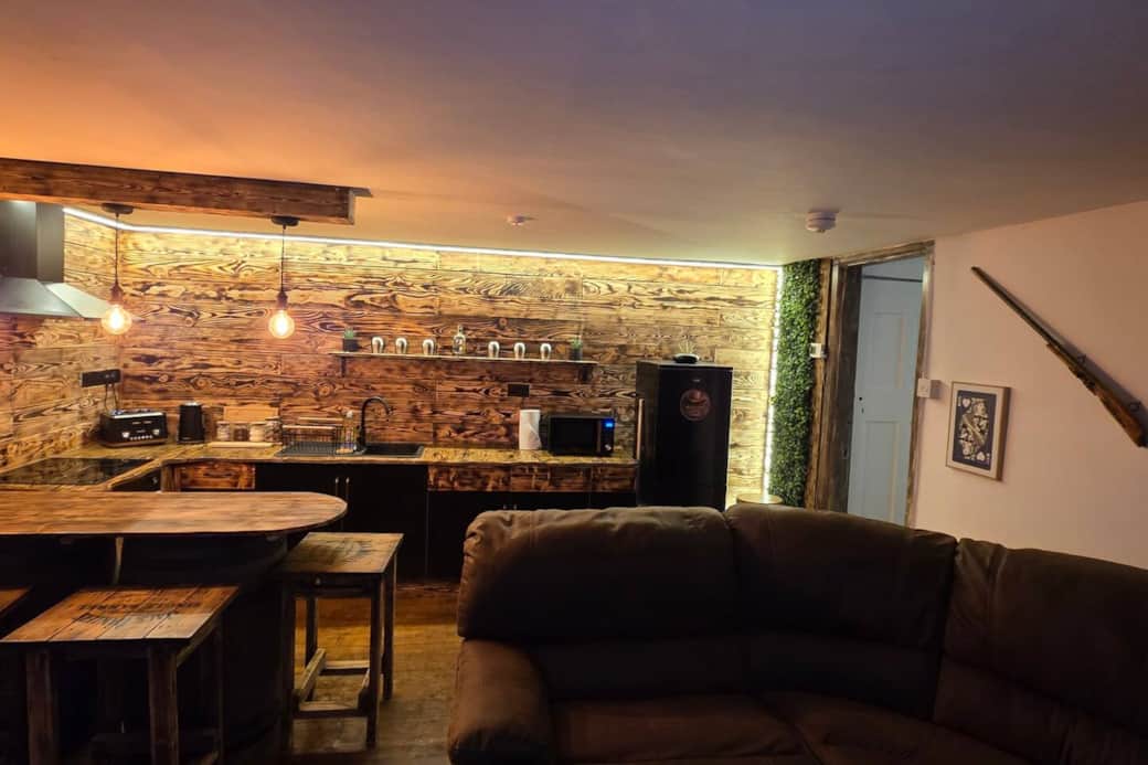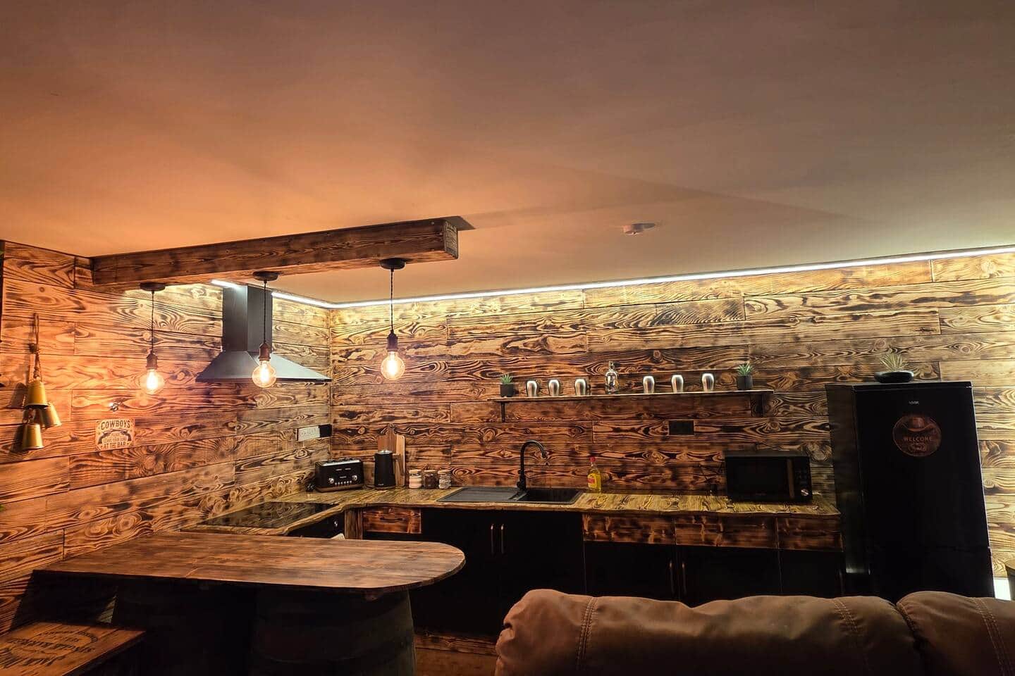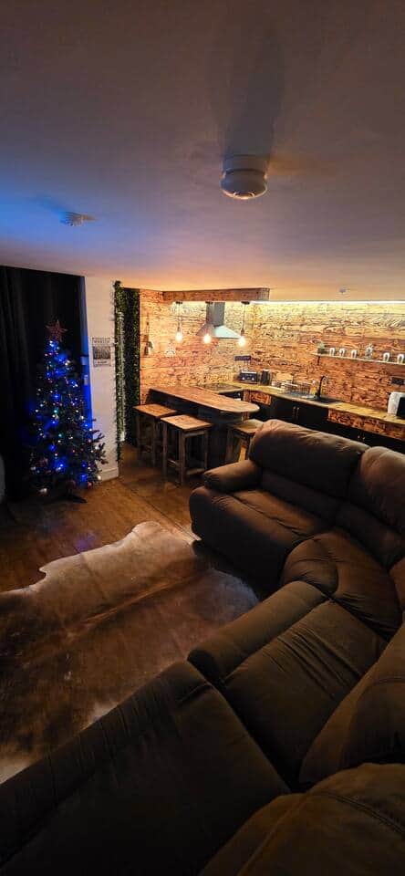 🏇 Sheriff’s Room – Western-inspired double bedroom featuring cowboy hats, a wood-panelled headboard with soft white backlighting, two dreamcatchers, and a charming wardrobe for your belongings.